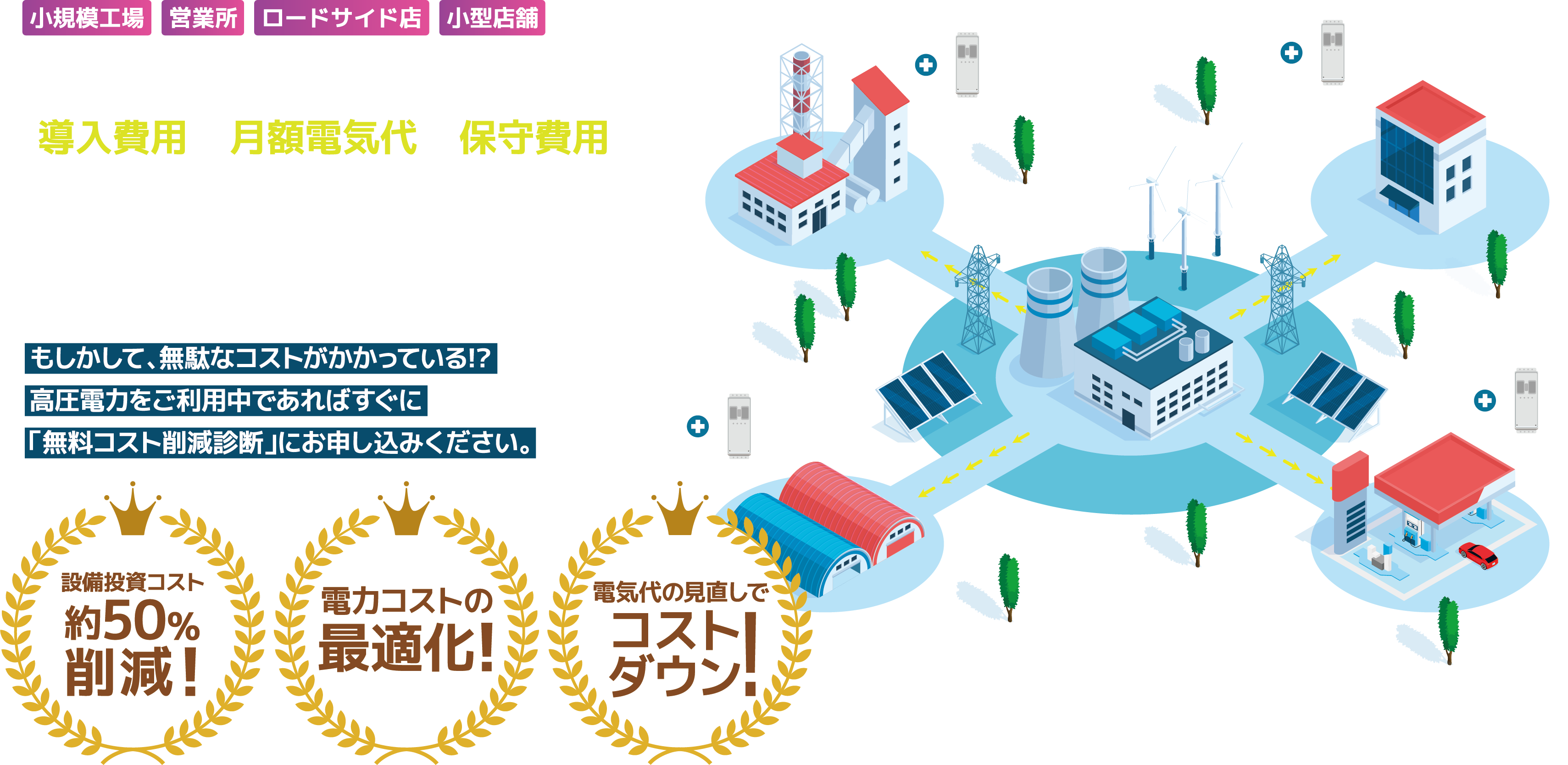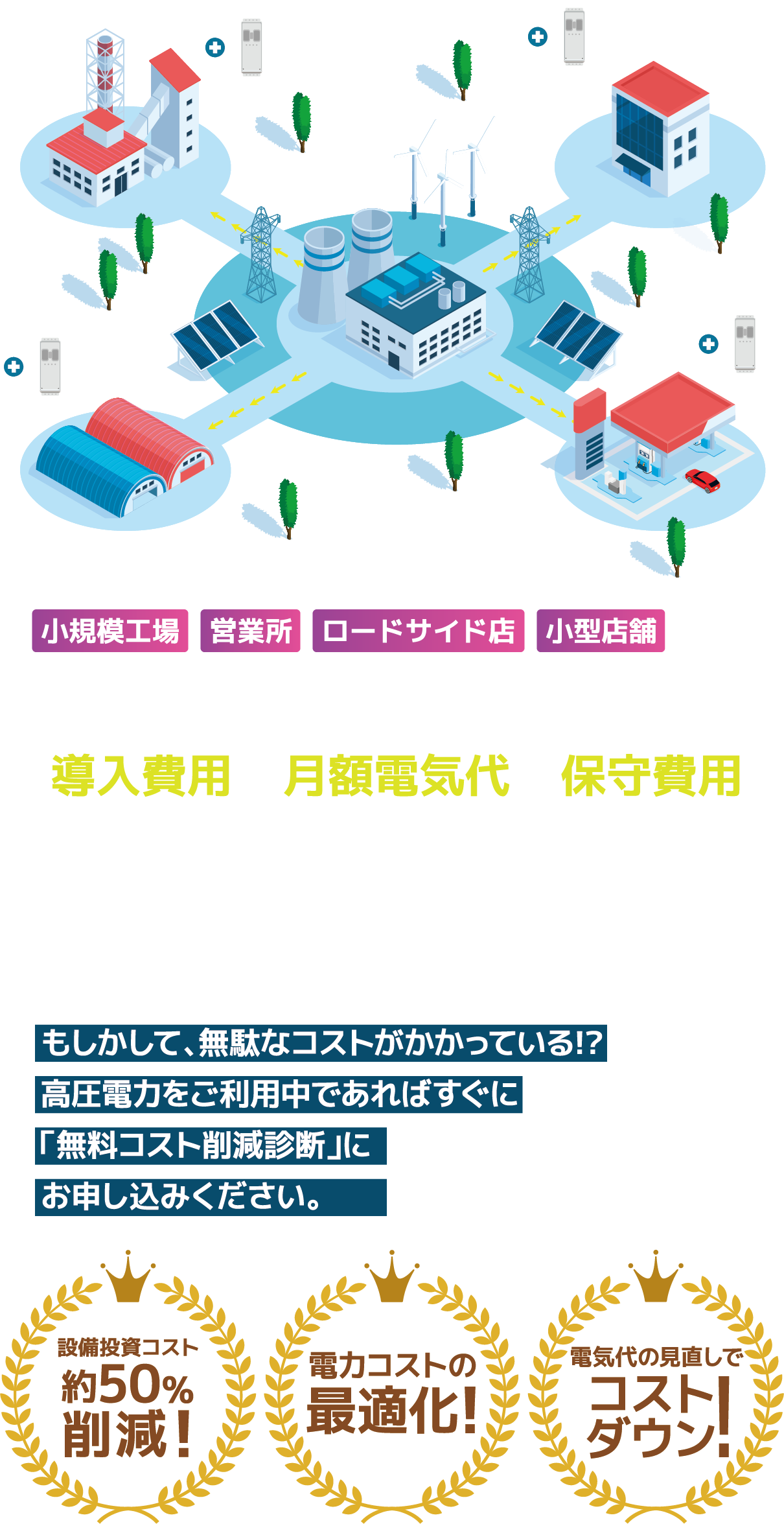契約電力最大150kw未満の(エリアによる)本来であれば高圧電力が必要とされる事業者様が対象となります
